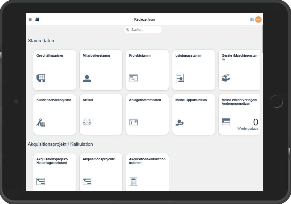 • In der App sind Basisfunktionen enthalten, wie Zugriff auf Geschäftspartner-Stammdaten, Projektstammdaten, Zeit- und Reisekostenerfassung, Freigabe / Anträge, Support-Desk